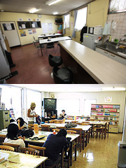 校内ではUSENによるBGMを流しております。明るく開放的な広々とした空間でインターバルはリラックス。テレビやマンガ、最新刊の雑誌も常設。窓からはコースが一望でき教習状況を見学すること出来ます。また、飲食の自動販売機や休憩スペースも完備しております。